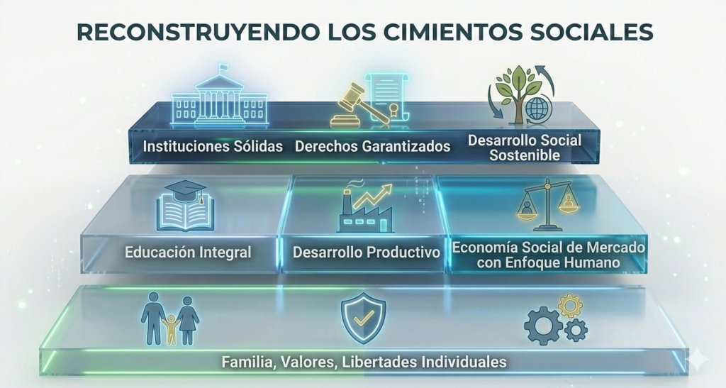 Reconstrucción implica volver a edificar sobre bases firmes. RRR promueve la defensa de la familia como célula básica de la sociedad, el fortalecimiento de las libertades individuales y la recuperación del sentido de responsabilidad cívica. A través de una economía social de mercado con rostro humano, impulsa condiciones que favorecen el desarrollo productivo, la generación de riqueza legítima y el ejercicio efectivo de los derechos fundamentales.